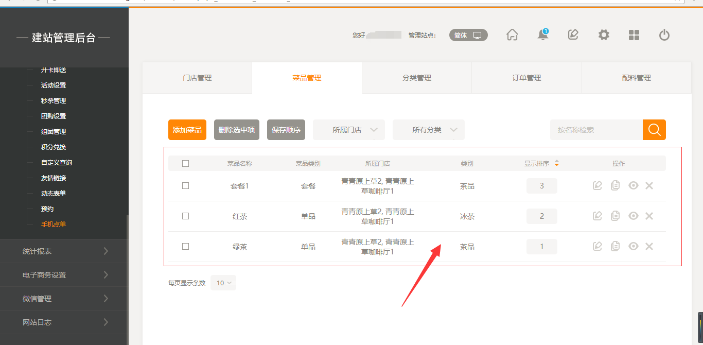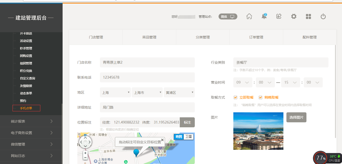 1.首先,点击“后台管理”-“手机点单”-“门店管理”-“添加门店”,填写完店面信息之后,我们点击保存即可(注:1.首先需要填写店面的地址然后可以拖动地图进行精确;2.店面最多添加30家店面),保存之后,我们添加菜品时有两个入口,一个是店面所对应的入口,一个是在菜品管理中可以选择所属店面,如图所示: